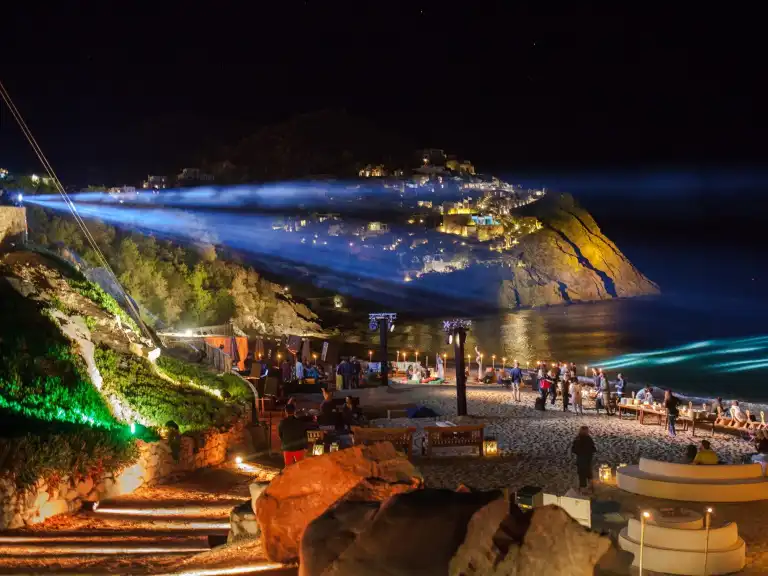 Unsere Resorts liegen vor einer türkisblauen Meereskulisse an einem der schönsten Sandstrände auf Mykonos. Bis zur Altstadt sind es nur knapp 20 Minuten.